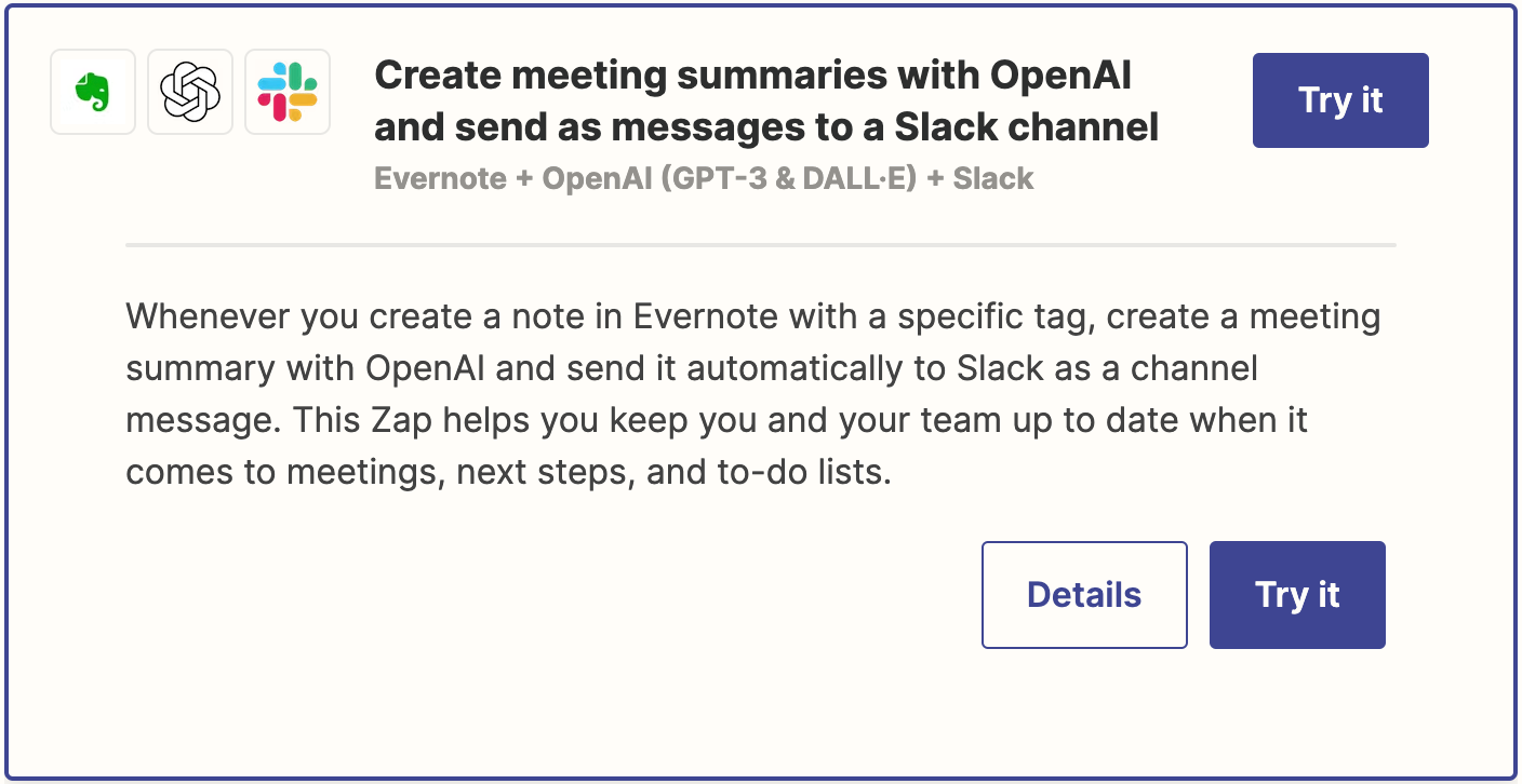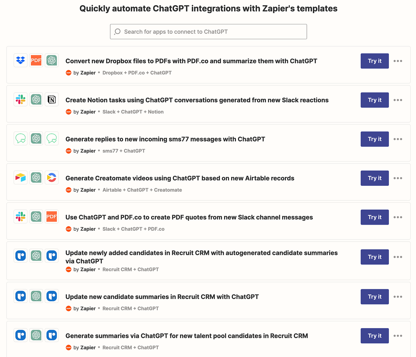 Here’s a small sample of some pre-made ChatGPT “Zaps” (aka automations) already available in Zapier: