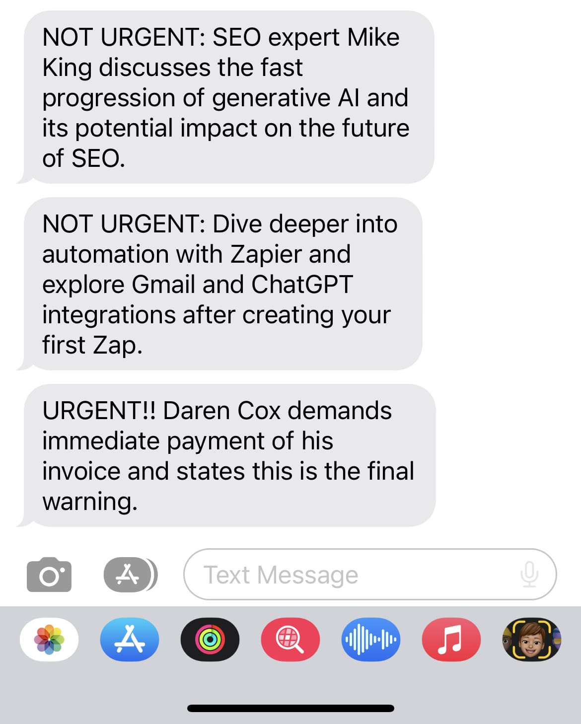 Sends an SMS of the one-sentence summary prepended with “URGENT!!” or “NOT URGENT:” to your mobile/cell phone