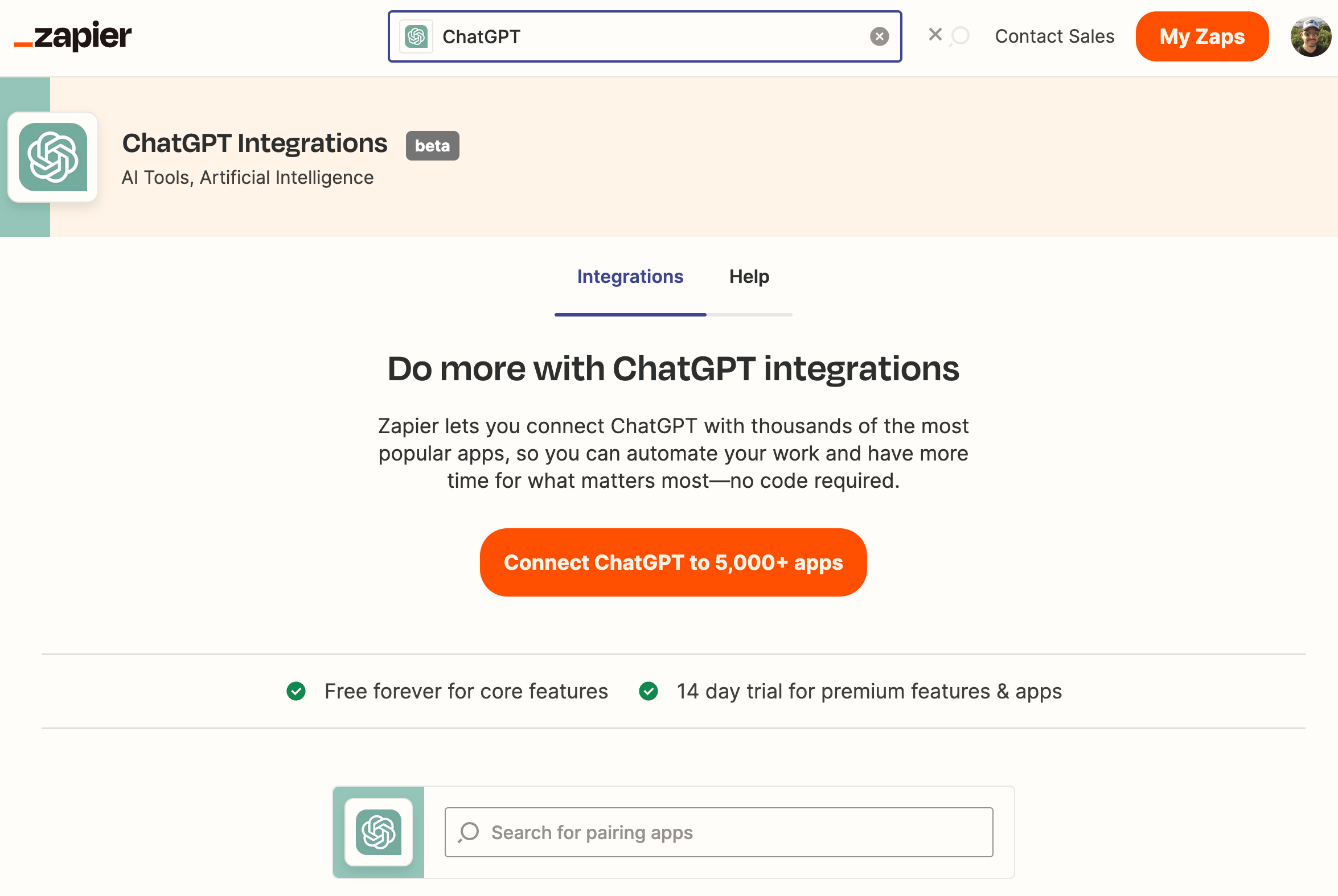 Prior to ChatGPT integration, I used Zapier to do things like, hook up my email system and share website analytics to Slack, as well as SMS me when a new Typeform or other event occurred.