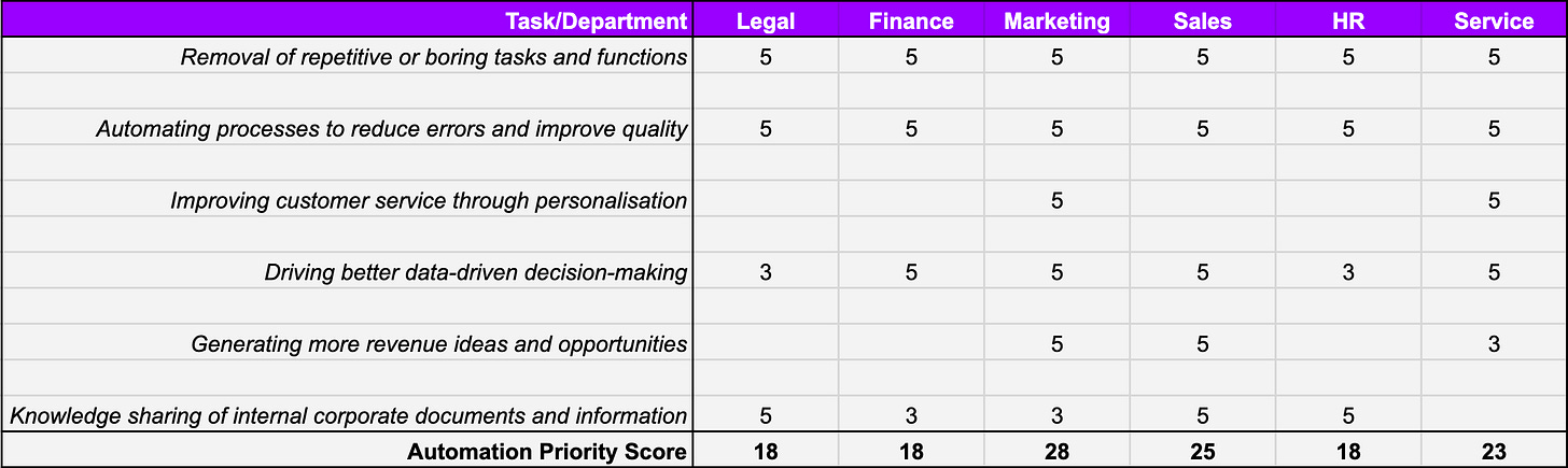 Finally, sum the priority score for each column for the function line to get an overall automation priority score.