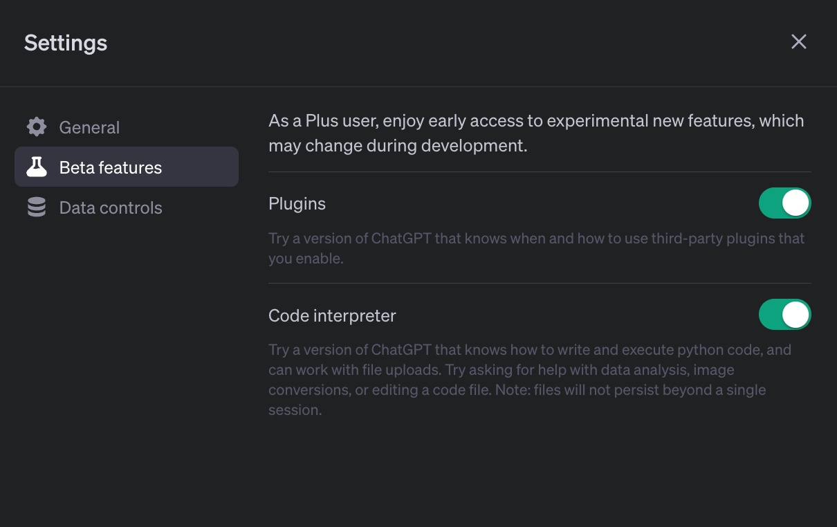 Select “Beta features” and slide the button for Code Interpreter to the right so it goes green.