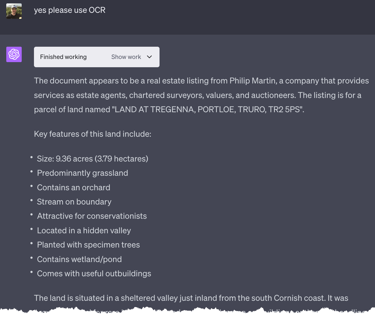 On the plus side, if Code Interpreter fails to read the PDF document, it also helpfully suggests using an OCR (Optical Character Reading) library to extract the text, as in the case of the above real estate PDF,
